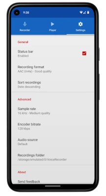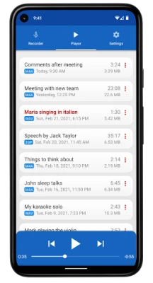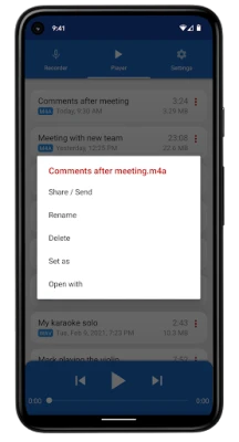 Управлението на вашите записи никога не е било толкова удобно. Използвайте вградения мултимедиен плейър за лесно прослушване, точно както с всеки MP3 плейър. Споделяйте незабавно вашите аудио файлове чрез имейл или други приложения, преименувайте ги, изтривайте ги или ги задайте като мелодия за звънене, аларма или звук за известие. Опцията "Отваряне с" ви позволява безпроблемно да експортирате и редактирате звуци в други приложения. Управлявайте записващото устройство и плейъра директно от лентата за състояние, а LED индикаторът за уведомяване (ако вашето устройство го поддържа) ще ви информира за активен запис или възпроизвеждане при изключен екран. Приложението автоматично спира запис при недостиг на памет и предлага гъвкави опции за сортиране по дата, име, размер и продължителност, както и възможност за запазване на звуците в мултимедийната библиотека на Android.