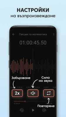 Но Sound Recorder Plus не е само за запис – той предлага и първокласно изживяване при възпроизвеждане. Независимо дали предпочитате бърз преглед чрез мини плейъра в списъка със записи, или се нуждаете от разширените функции на пълноекранния плейър, контролът е във Вашите ръце. Регулирайте скоростта на възпроизвеждане от 0.25x до 2.0x, за да уловите всяка дума или нота. С прецизните контроли можете лесно да навигирате през записа до желания момент. Споделянето на ценни моменти, идеи, гласови бележки или музикални таланти с приятели и колеги е улеснено, позволявайки Ви да разпространявате съдържанието си без усилие.